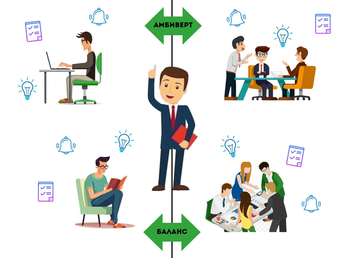 Итак, амбиверт — это человек, который сочетает в себе черты интроверта и экстраверта. Именно эта гибкость позволяет ему эффективно адаптироваться к различным рабочим условиям.