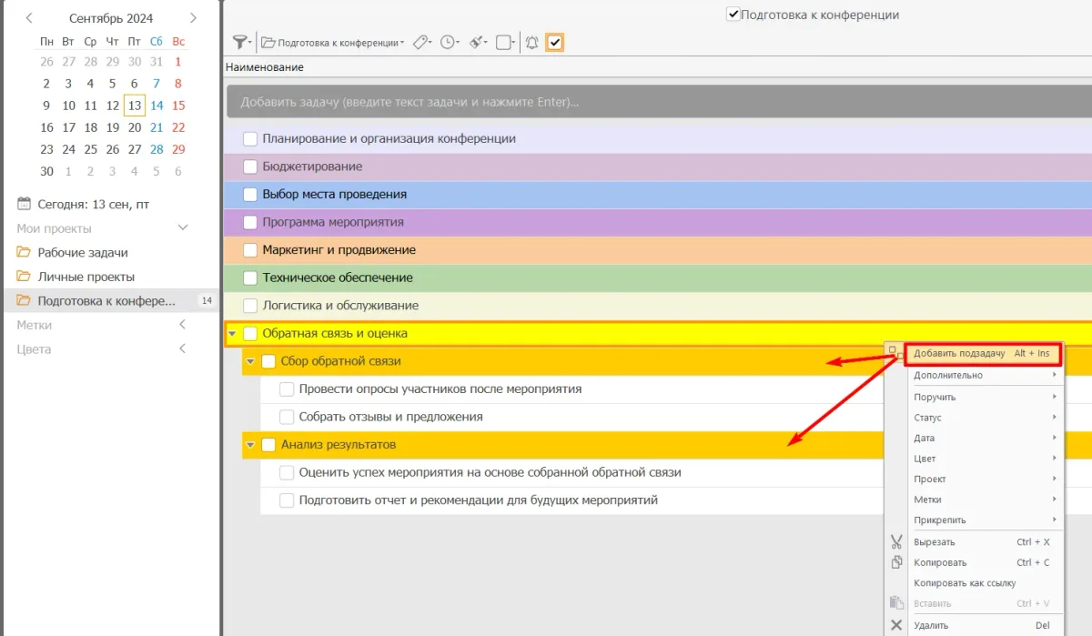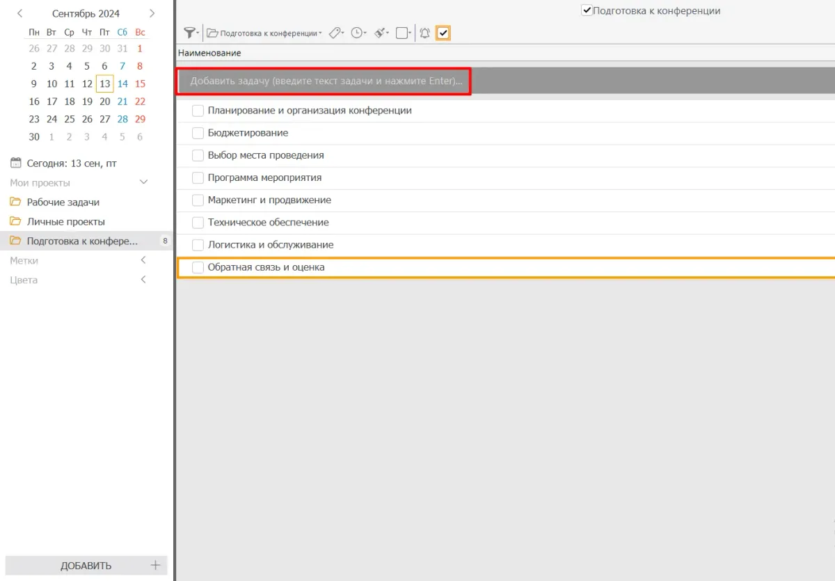 **Шаг 2. Создайте и настройте задачи. **Для этого введите текст задания в поле «Добавить задачу».