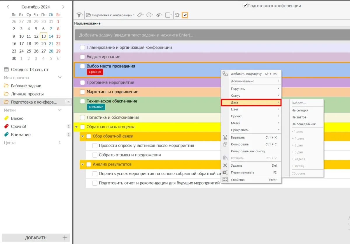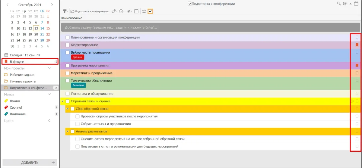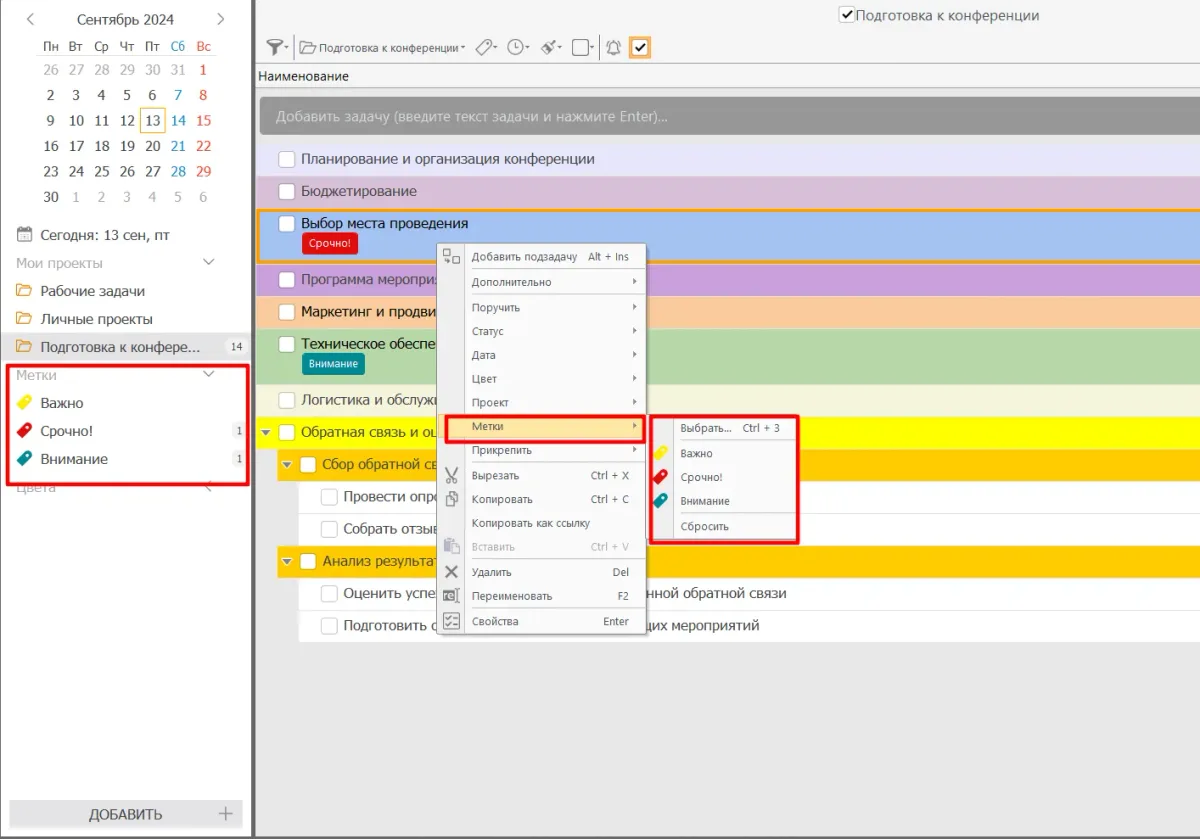- Используйте метки «Важно», «Срочно», «Внимание», чтобы выделить самые важные задачи. Для приоритизации используйте систему АБВГД или матрицу Эйзенхауэра. Так вы сможете правильно сбалансировать рабочую нагрузку.