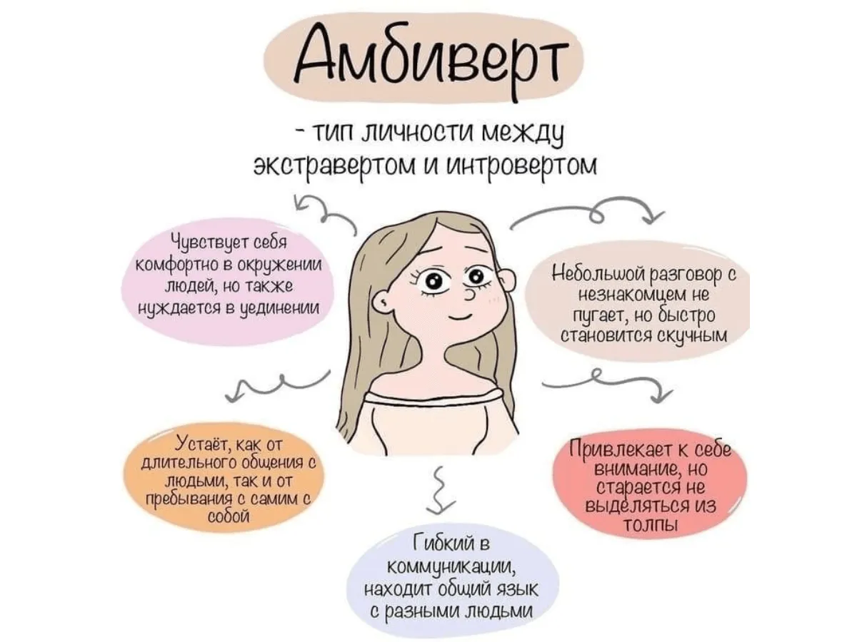 Это человек, который сочетает в себе черты как интроверта, так и экстраверта. Говоря простыми словами, амбиверт находится между двумя крайностями: он может быть общительным и активным, но в то же время ценит уединение и тишину.