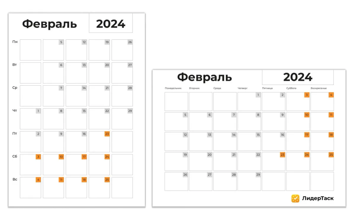 Шаблон календаря на февраль 2024