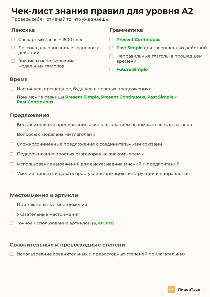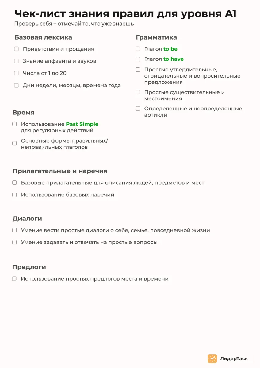 Этот чек-лист поможет вам систематизировать и проверить свои знания для уровня A1. Отметьте пункты, которые вы уже знаете, и используйте это как руководство для дальнейшего обучения, если только начинайте изучать язык.
