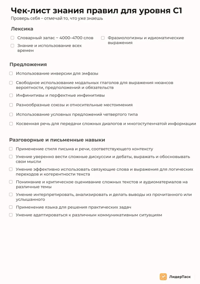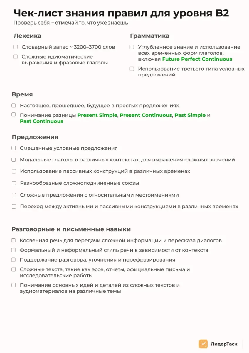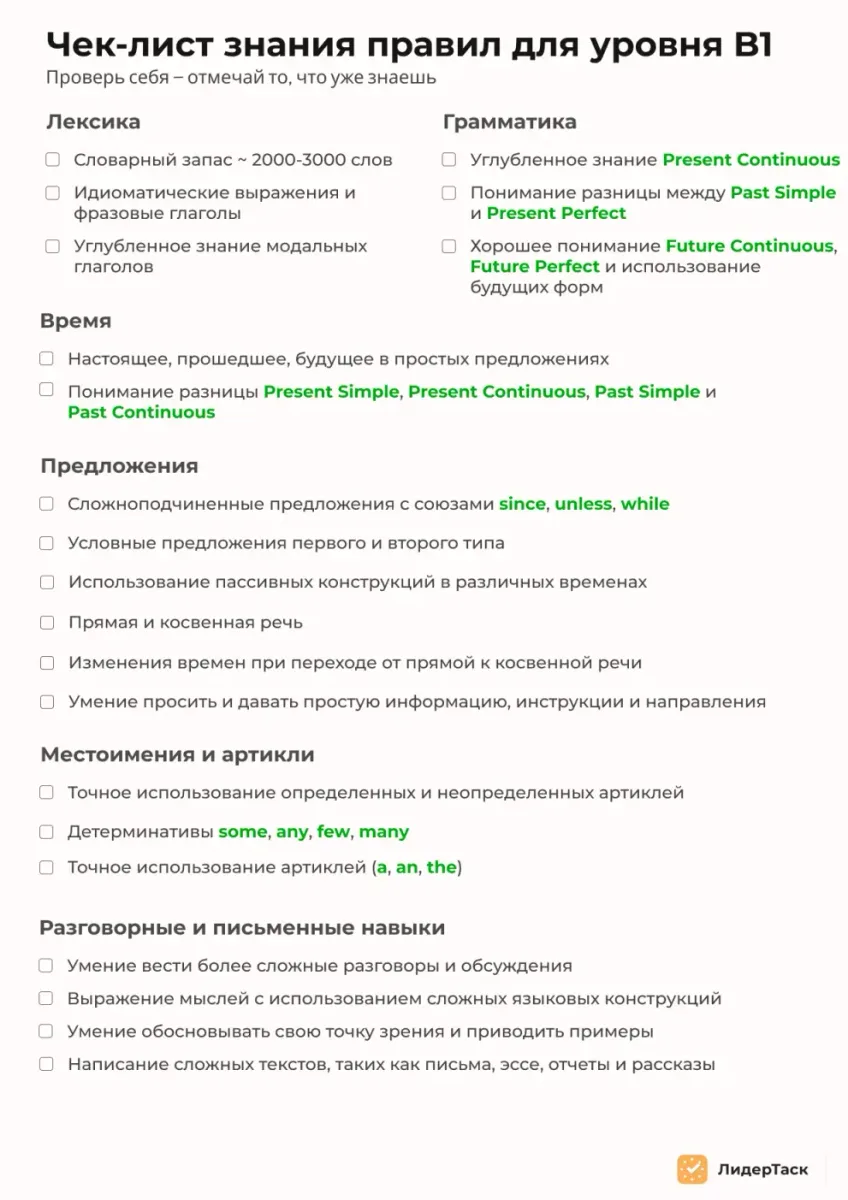 Чек-лист по правилам и уровням языка