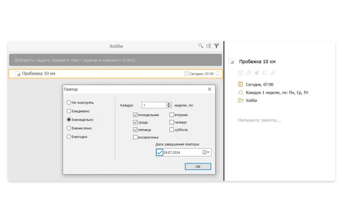 В ЛидерТаске легко работать с привычками. Для этого нужно поставить задачу и сделать ее повторяющейся. Повтор можно настроить по дням, неделям, месяцам или ежегодно. Например, если ходите в зал три дня в неделю, можно установить напоминание о тренировке на понедельник, среду и пятницу.