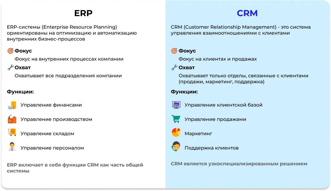 ERP-системы помогают управлять внутренними процессами компании, а CRM-системы сосредоточены на клиентах и продажах.