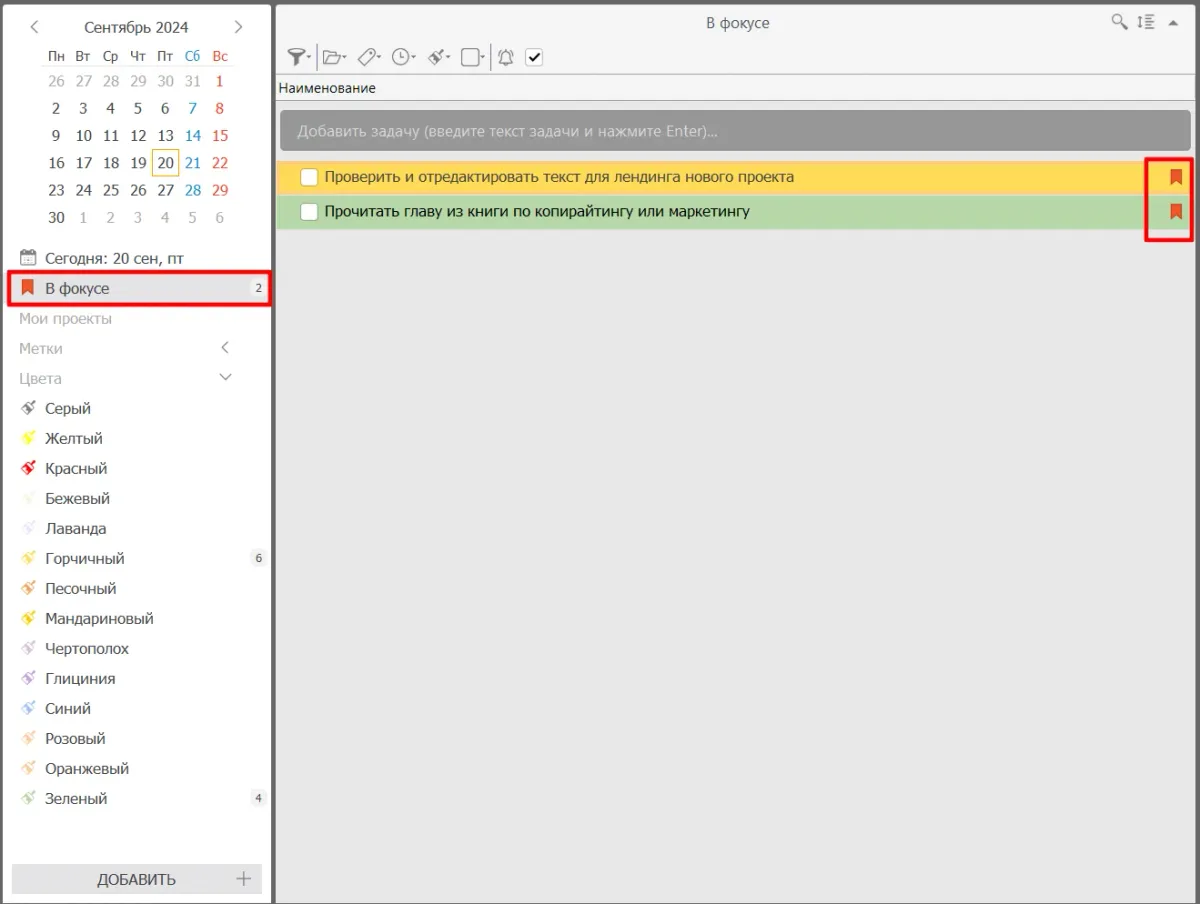 Функция «Фокус» для концентрации на важных задачах. Помогает сосредоточиться на приоритетных заданиях. Она поможет выделить дела на фоне других задач. Просто нажмите на флажок справа от задания. Также для этой функции есть отдельный раздел в навигаторе. Эта функция особенно полезна для тех, кто испытывает трудности с концентрацией из-за постоянных уведомлений и информационной перегрузки.