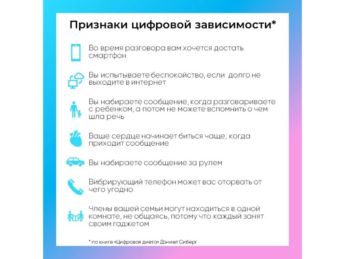 Помните: digital-диета — это марафон, а не спринт. Не стоит ждать мгновенных результатов. Постепенно внося изменения в свою жизнь, вы заметите, как улучшается самочувствие, повышается продуктивность и укрепляются отношения с близкими.