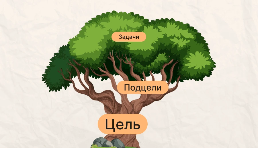 Пример: Если цель — запустить новый продукт, можете разбить ее на подцели, такие как исследование рынка, разработка прототипа, тестирование и маркетинг. Каждая из этих подцелей затем дополнительно делится на конкретные задачи.