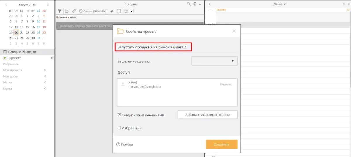 - Дайте проекту понятное название, которое отражает его суть. В нашем случае это будет «Запустить продукт X на рынок Y к дате Z», который мы использовали в пошаговом руководстве.
