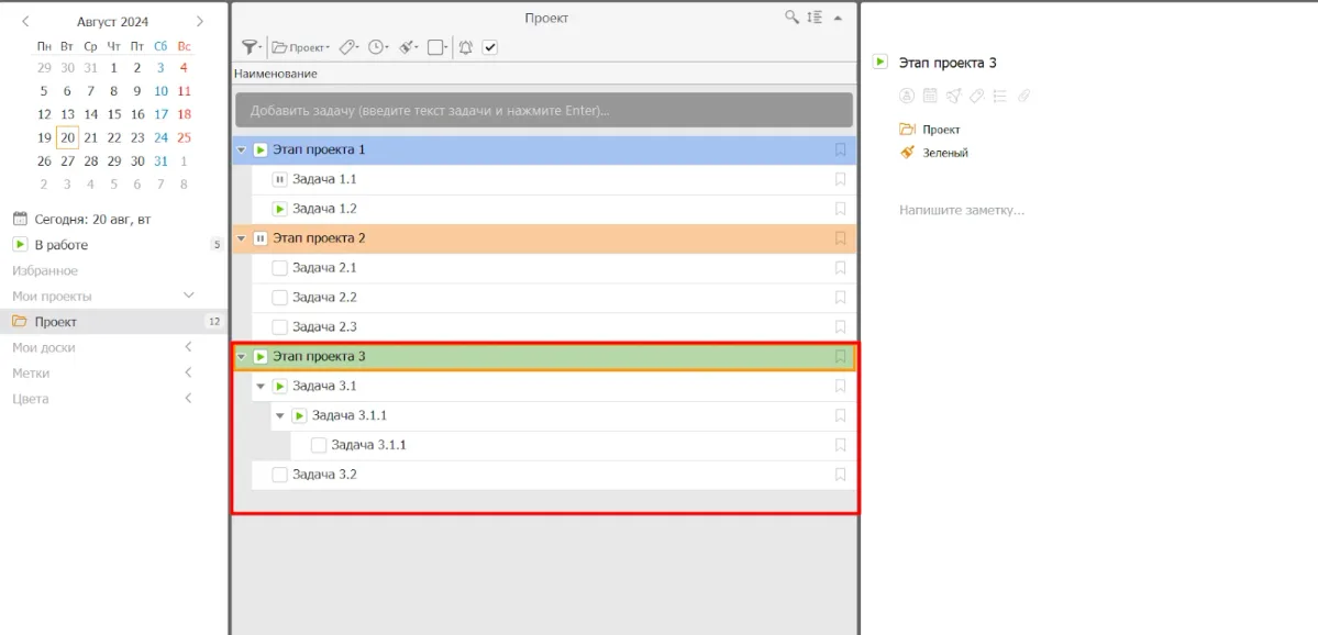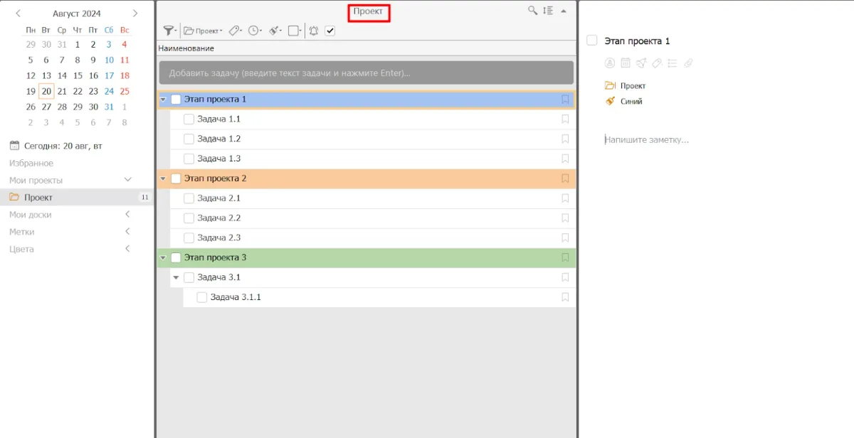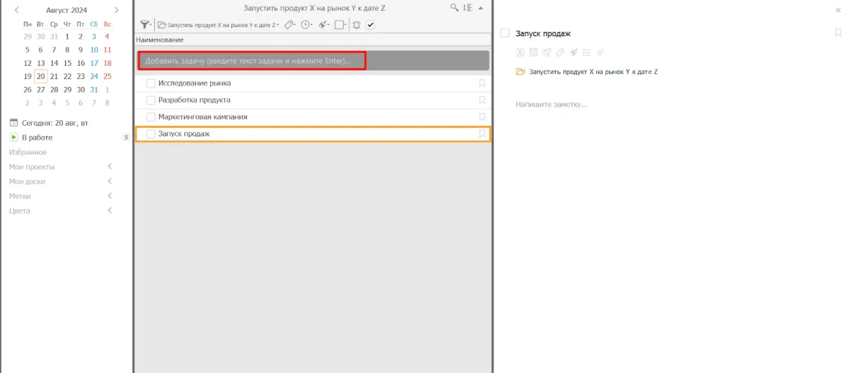 - Разбейте проект на несколько крупных этапов — исследование рынка, разработка продукта, маркетинговая кампания, запуск продаж. Для этого просто добавьте задачу наверху в поле ввода. Каждый этап станет отдельной задачей верхнего уровня.