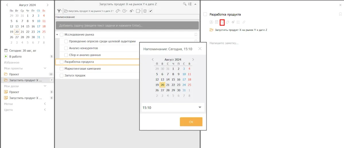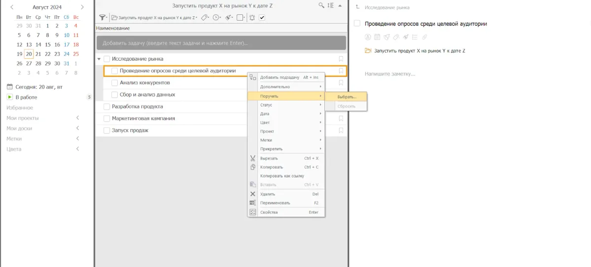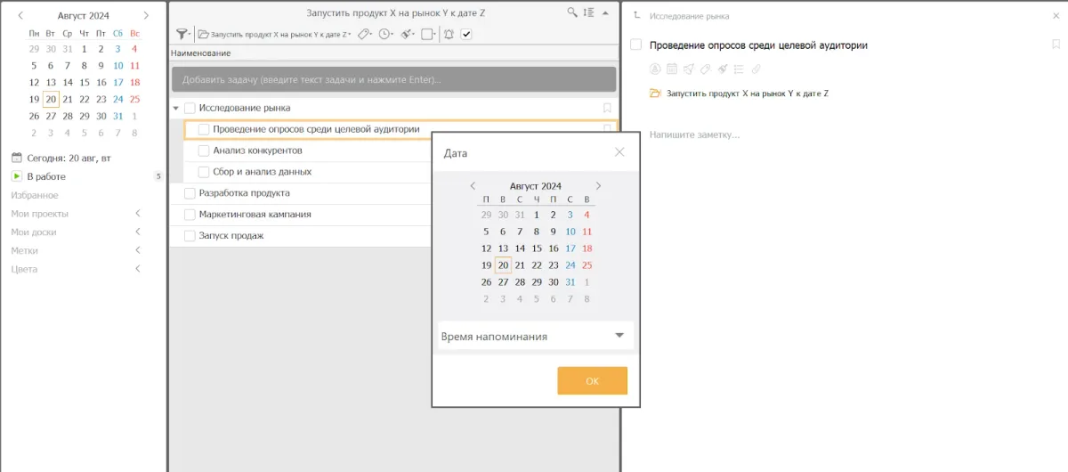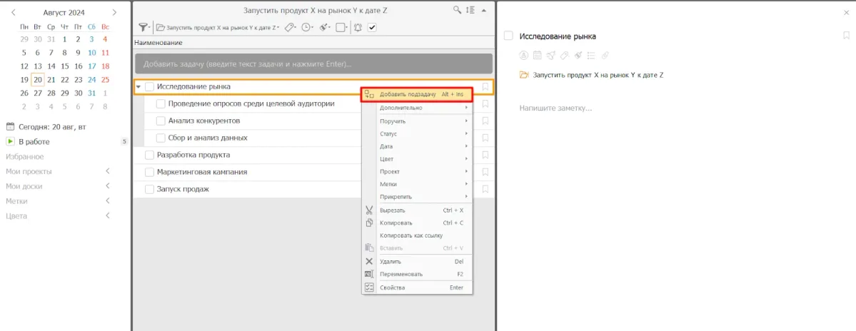 - Используйте функцию создания подзадач для дальнейшего детализирования. Например, этап «Исследование рынка» делим на «Проведение опросов среди целевой аудитории», «Анализ конкурентов», «Сбор и анализ данных».