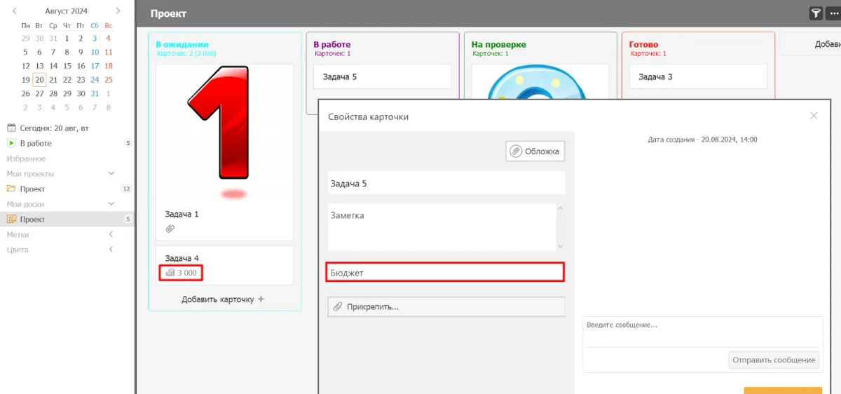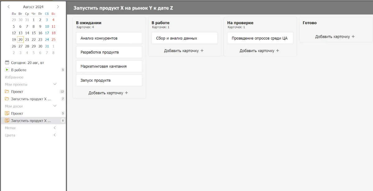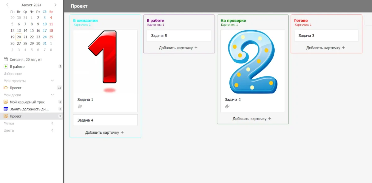 Канбан-доски позволяют визуализировать процесс выполнения дел. Можете создавать разные колонки, например, «В ожидании», «В работе», «На проверке» и «Готово», и перемещать задания между ними. Это помогает: