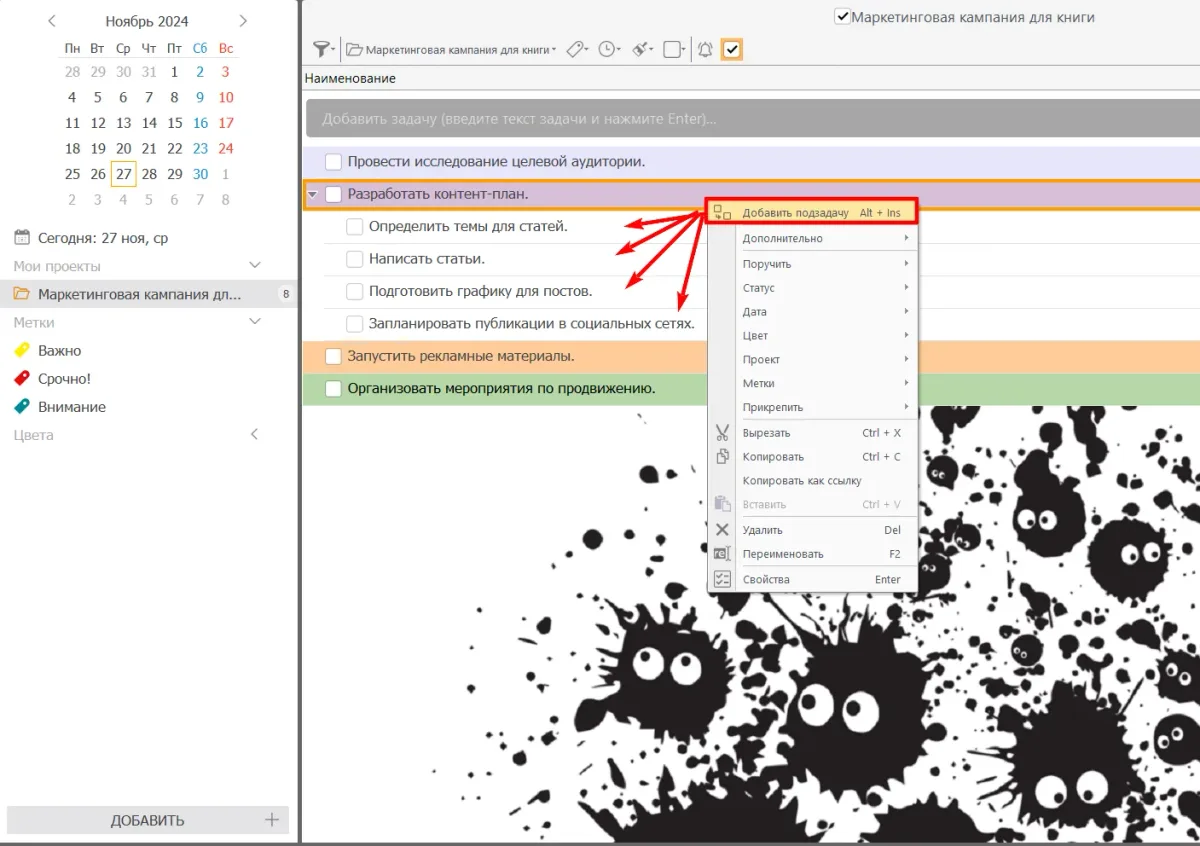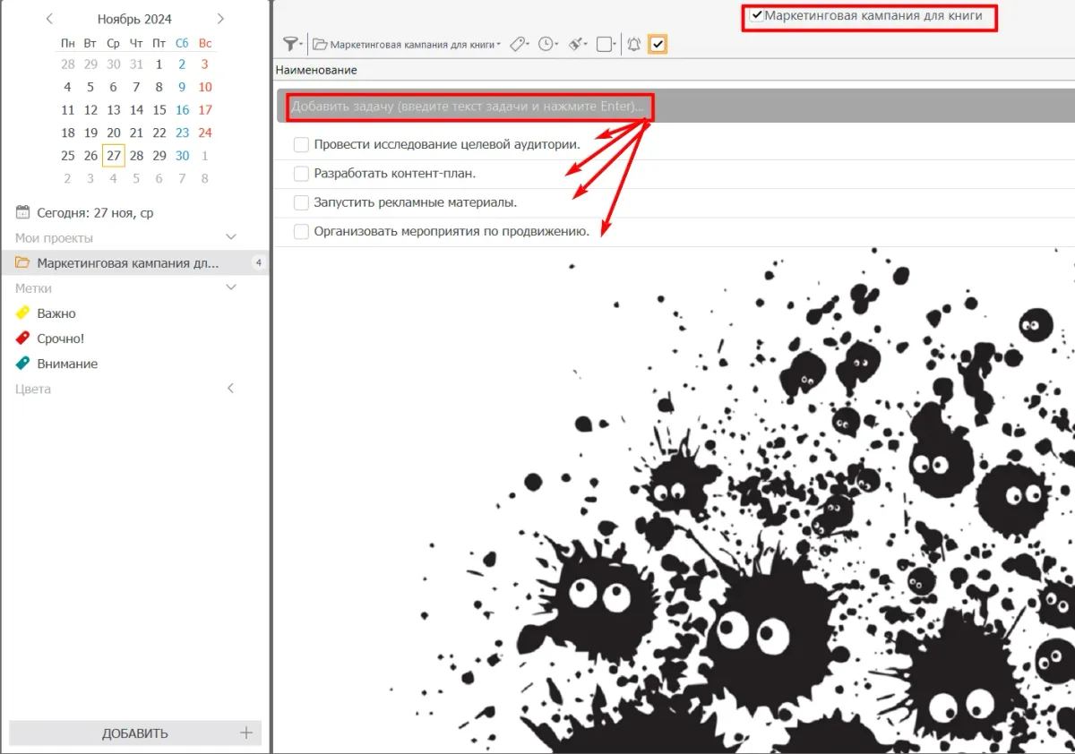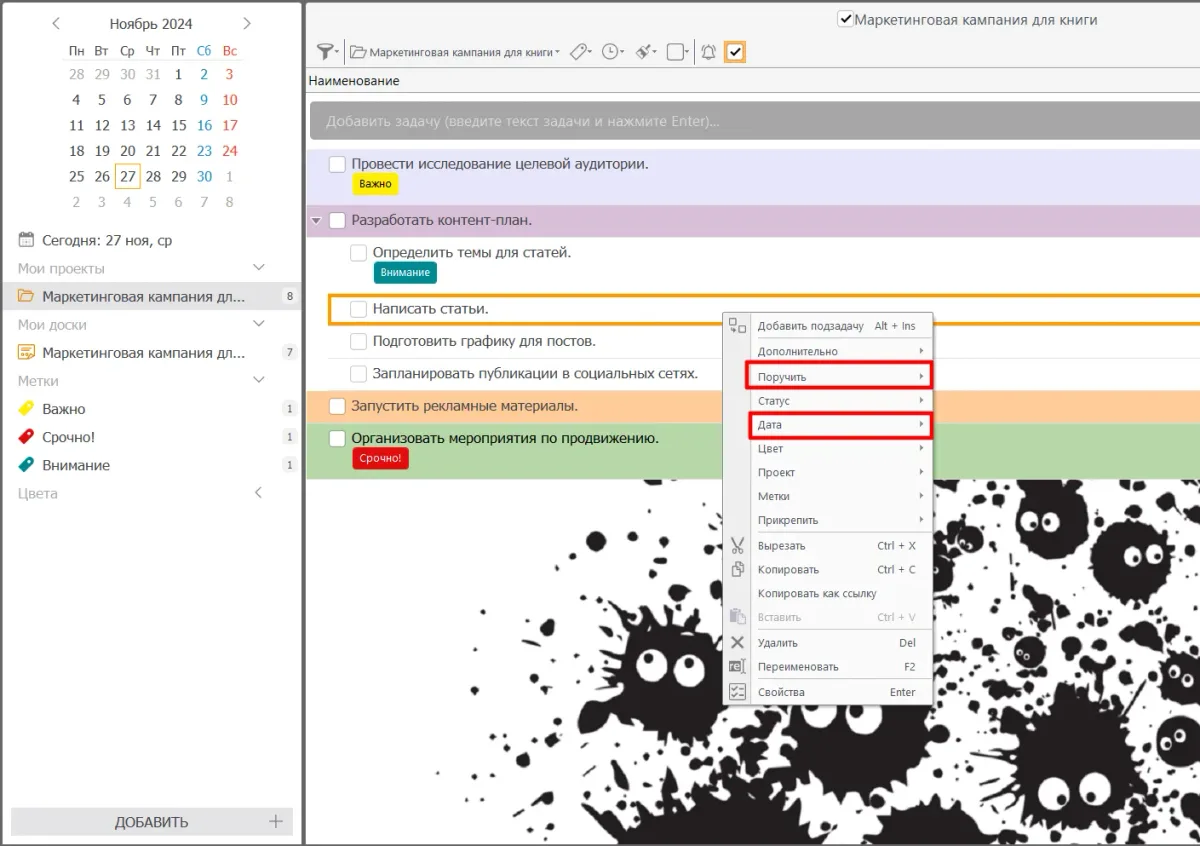 Таск-менеджер предлагает множество инструментов для организации дел: