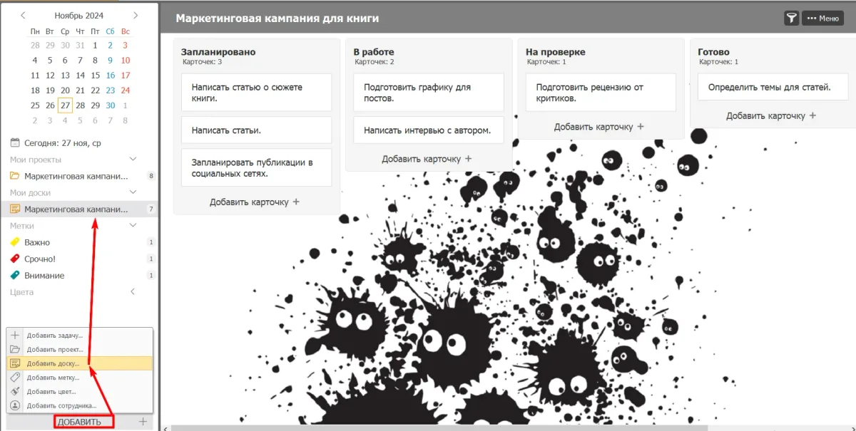 - Канбан-доски: визуализируйте работу и следите за прогрессом.