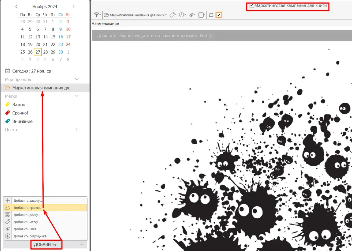 Марина открывает ЛидерТаск и создаёт новый проект под названием «Маркетинговая кампания для книги». Это позволит ей сосредоточиться на всех связанных задачах в одном месте.