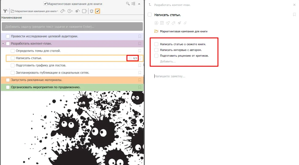 Для каждой подзадачи Марина создает чек-листы, чтобы отслеживать выполненные действия. Например, в действии «Написать статьи» она добавляет пункты: