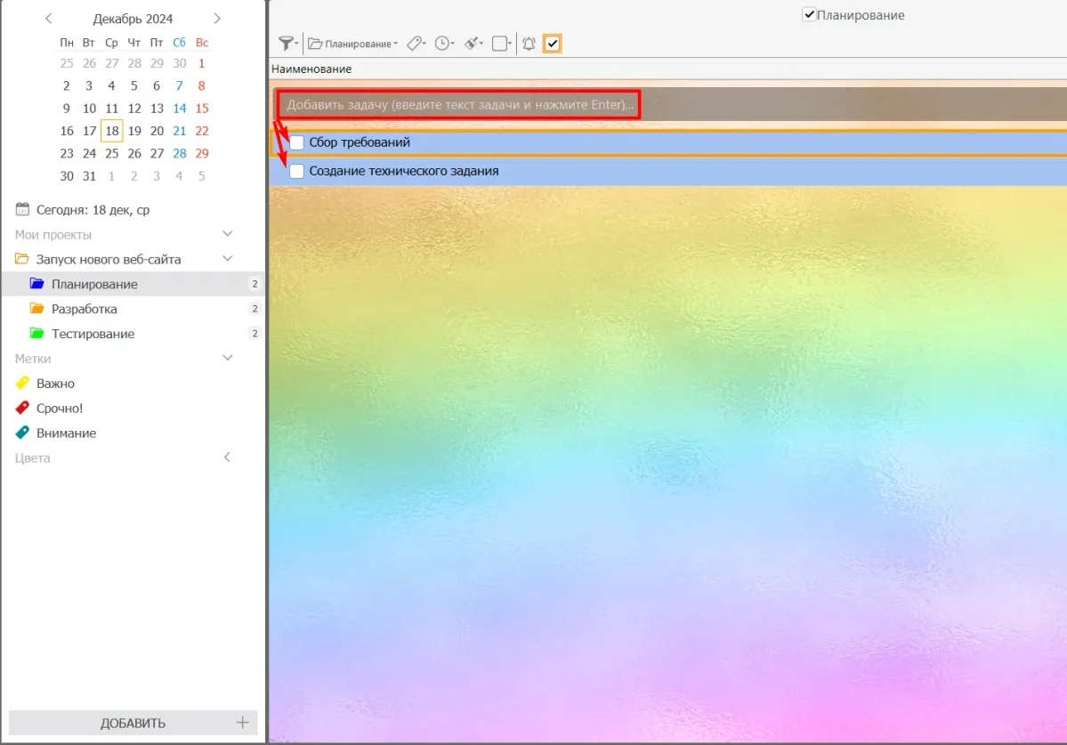 Шаг 2. Разбейте проект на этапы и задачи. Внутри проекта создайте основные этапы и присвойте им определенный цвет, например, «Планирование» — синий, «Разработка» — оранжевый, «Тестирование» — зеленый.