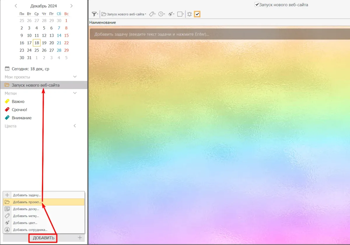 Шаг 1. Создайте проект. Откройте приложение и перейдите в раздел проектов. Нажмите «Добавить проект» и задайте ему название, например, «Запуск нового веб-сайта».