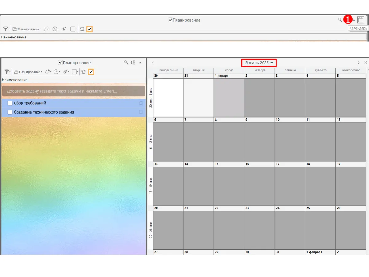 **Шаг 3. Включите режим календаря. **Нажмите на иконку в правом верхнем углу. Перед вами откроется календарь. Настройте его в нужный диапазон времени. В нашем случае это будет январь, как показано в примере диаграммы Ганта выше.