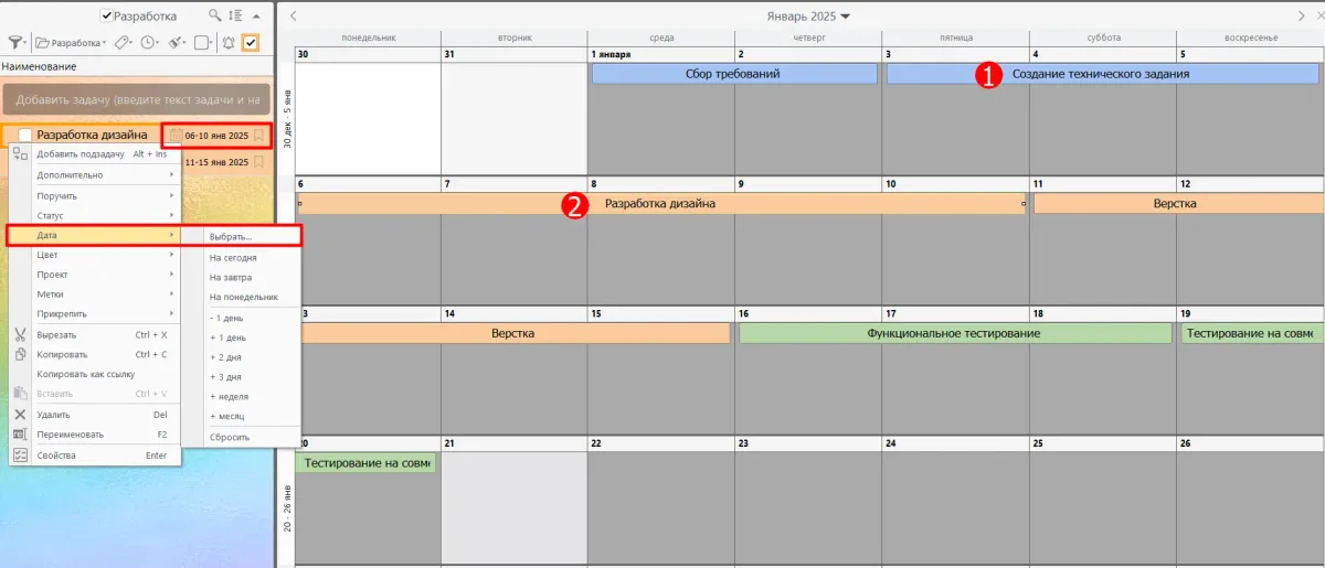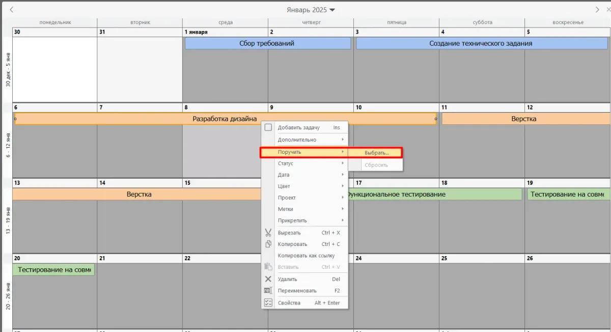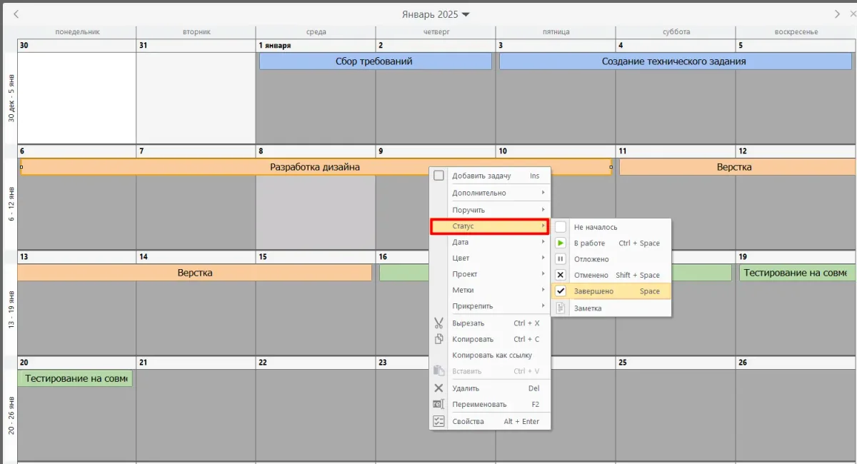Наглядная визуализация: в календаре видно, как распределены дела по времени и какие задания наиболее критичны. Это помогает лучше планировать ресурсы и избегать задержек.
