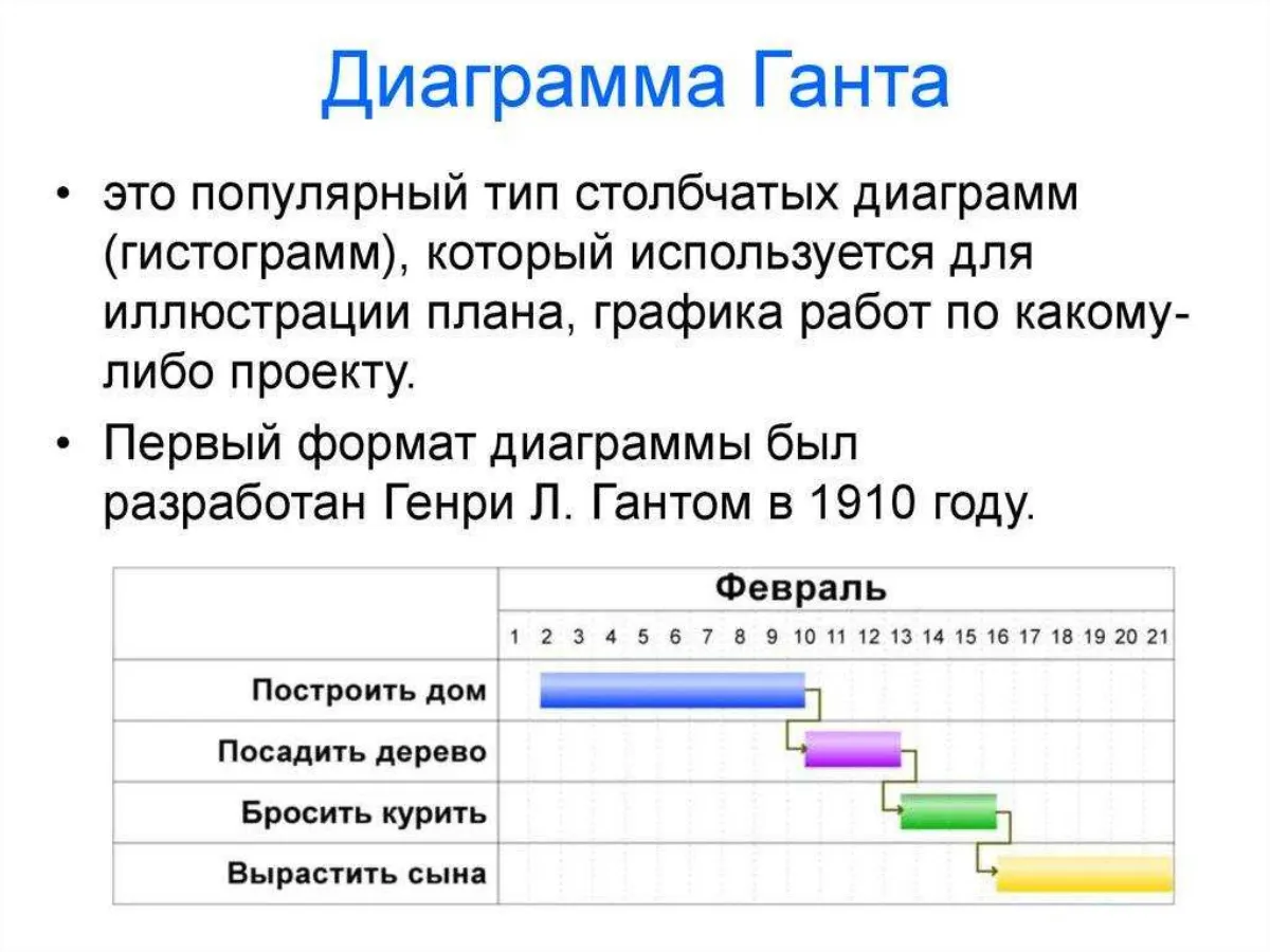 Таким образом, диаграмма Ганта — это эффективный способ планирования и управления проектами, который помогает визуализировать план, контролировать выполнение дел и обеспечивать координацию в команде.