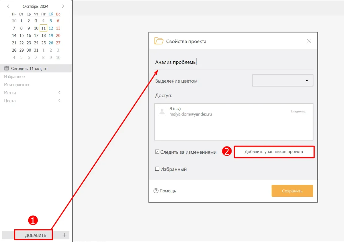 - Создайте проект и назовите его «Исследование проблемы». Добавьте участников.