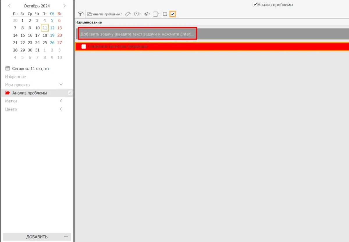 - Внутри проекта добавьте задачу, которая будет представлять основную проблему, например, «Снижение качества продукции». Убедитесь, что трудность четко сформулирована и понятна всем участникам.