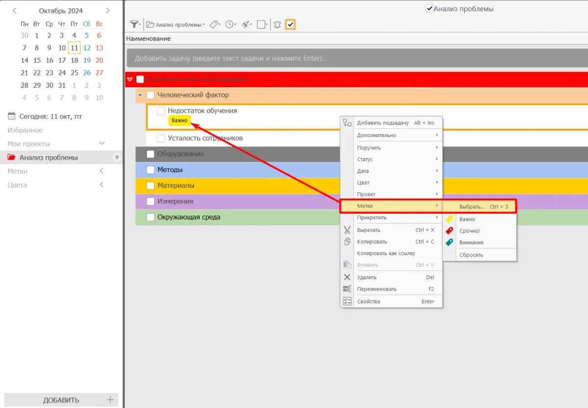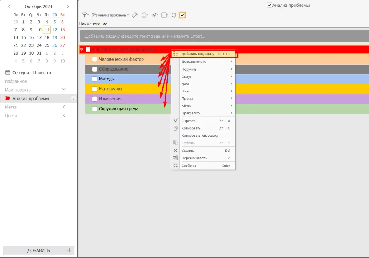 - Создайте подзадачи для каждой подпричины внутри соответствующей задачи. Например, под «Человеческий фактор» добавьте «Недостаток обучения», «Усталость сотрудников».