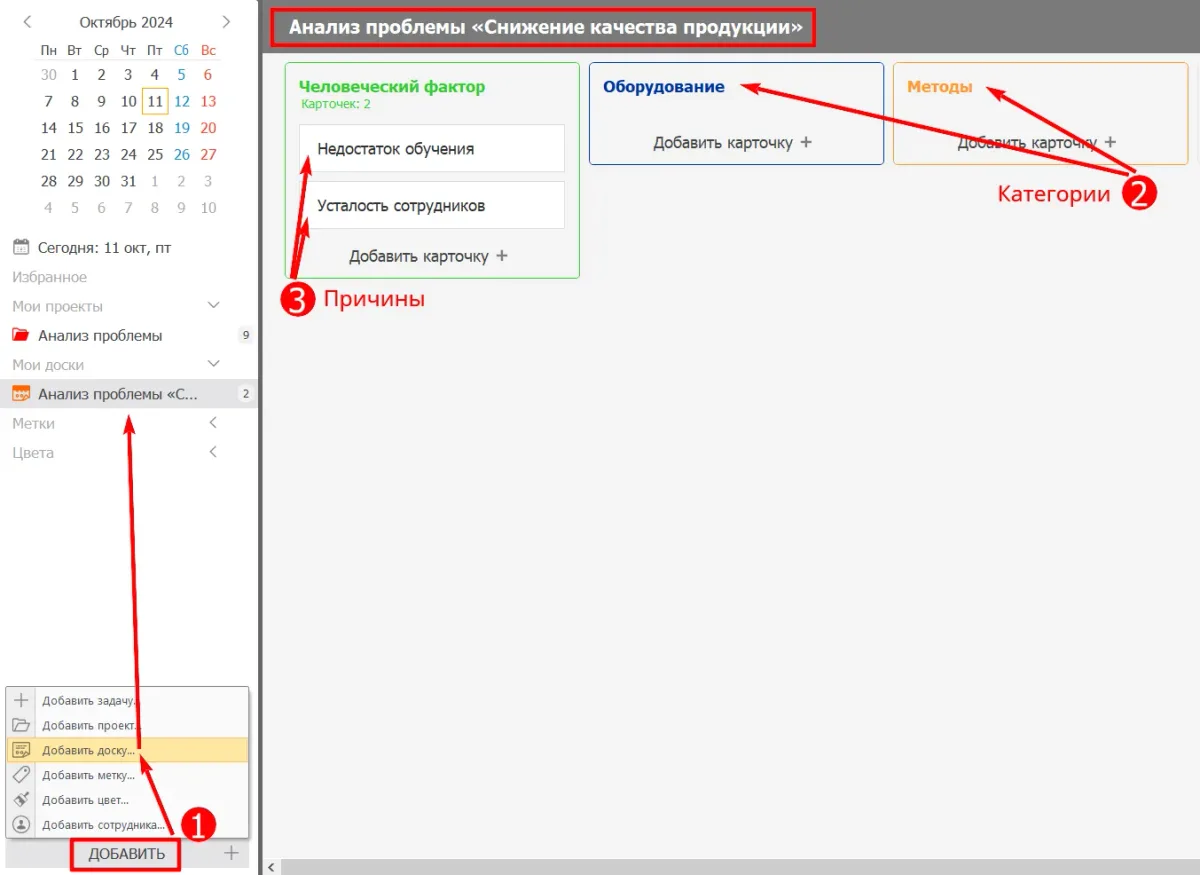 Каждая категория причин будет представлена в виде колонки на доске, куда можно добавлять карточки с подпричинами и идеями. Такое наглядное представление помогает команде лучше понять взаимосвязи и организовать мозговой штурм.