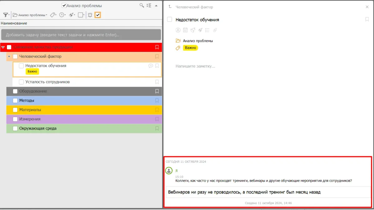 Это позволит собрать все данные и идеи, связанные с конкретной проблемой. В рамках проекта можно создать отдельные задачи для каждой причины, что упростит дальнейший анализ.