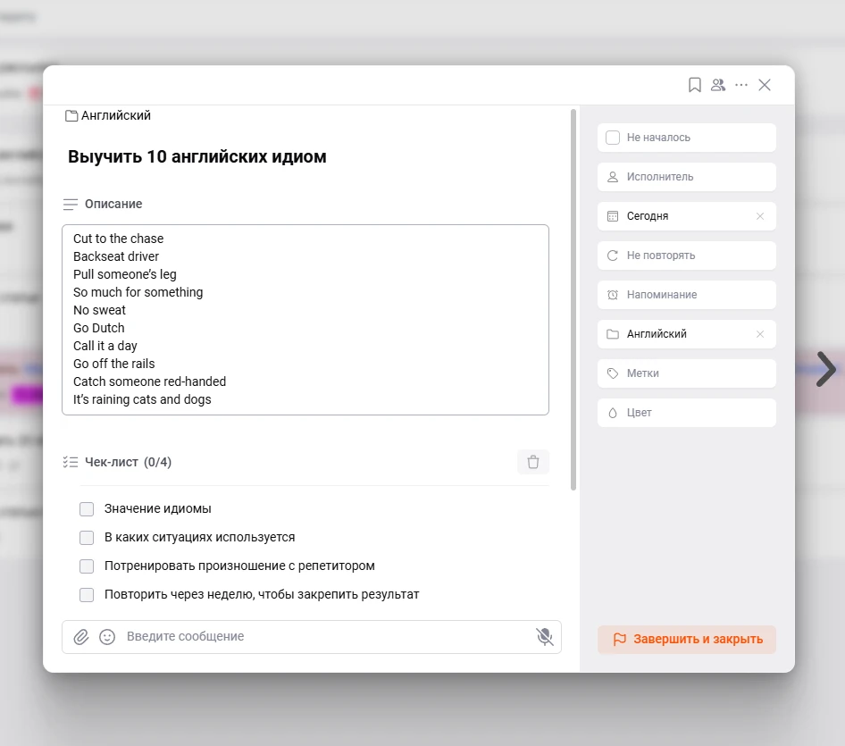 В ЛидерТаске задача может быть не просто короткой заметкой: внутри карточки доступны статус, дата и время, повтор, проект, метки, чек-лист, напоминание, файлы и чат. За счет этого разрозненные мысли превращаются в понятные рабочие единицы.