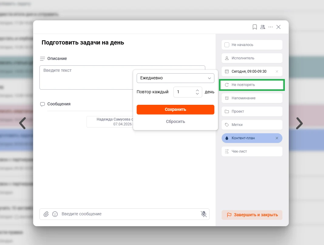 Напоминания и повторы в ЛидерТаске снижают этот фон: не нужно каждый раз заново держать в голове регулярные проверки, отчеты, созвоны, оплаты или личные дела. Сервис позволяет задавать точное время уведомления и создавать повторяющиеся задачи по нужному циклу.