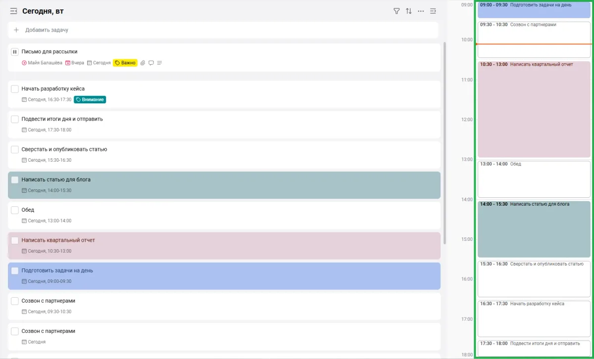 Календарь и ежедневник в ЛидерТаске помогают увидеть не абстрактный список обязанностей, а фактическую загрузку по времени: что нужно сделать сегодня, что уже просрочено, что реально поместится в день, а что лучше перенести. В web-версии задачи можно просматривать по датам и переносить по временной шкале. Это помогает вернуть более реалистичное восприятие нагрузки.