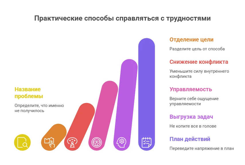 Когда человек сталкивается с препятствиями, он часто чувствует, что ничего не контролирует. Поэтому полезно выделить хотя бы небольшой участок, на который можно повлиять уже сейчас. Не всю проблему целиком, а один реальный следующий шаг. Это снижает тревогу и возвращает психике опору.
