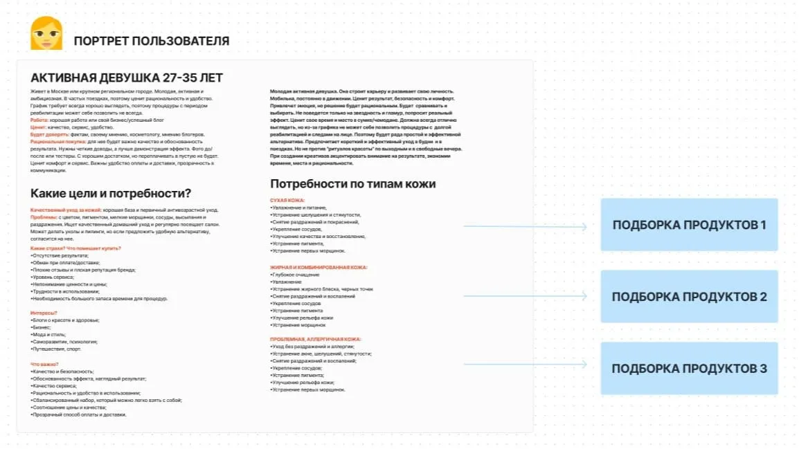 Один из обязательных элементов CJM – портрет пользователя, для которого составляется карта. Здесь детально описан один из приоритетных сегментов аудитории: интересы, приоритеты, барьеры, модели поведения и ожидания от продукта. На основании портрета предполагается составить подборки продуктов, которые будут закрывать каждую из возможных потребностей.