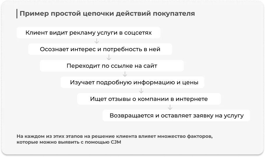 Такие остановки принято называть точками касания, в каждой из которых клиент получает опыт взаимодействия с бизнесом. CJM показывает полную историю такого взаимодействия:
