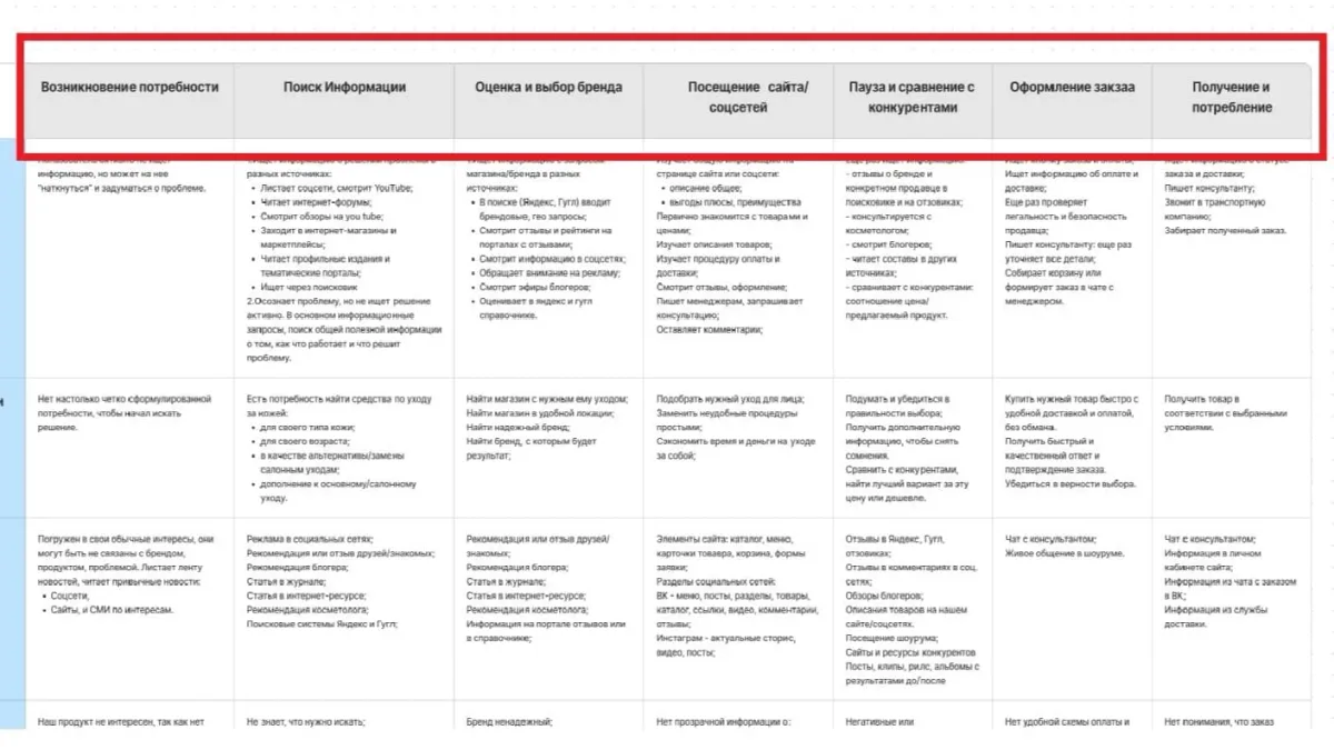 Структура CJM может отличаться и зависит от сферы бизнеса и степени проработки на разных этапах. Разберем подробный шаблон для интернет-магазина бьюти-товаров.
