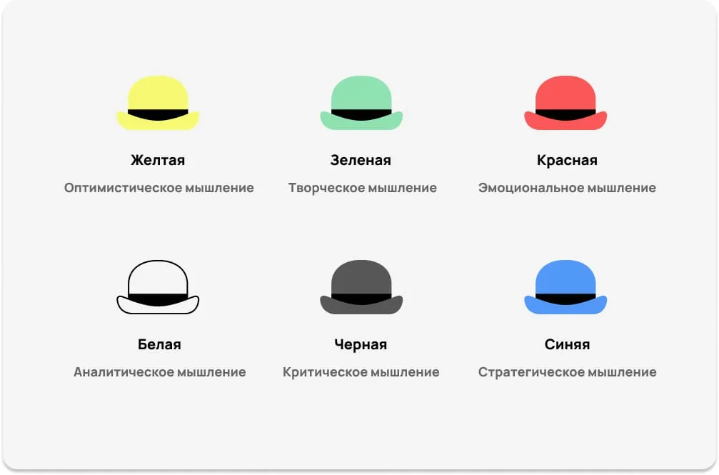 Метод 6 шляп мышления — подход, в котором каждая «шляпа» представляет определенный стиль мышления для анализа идеи.