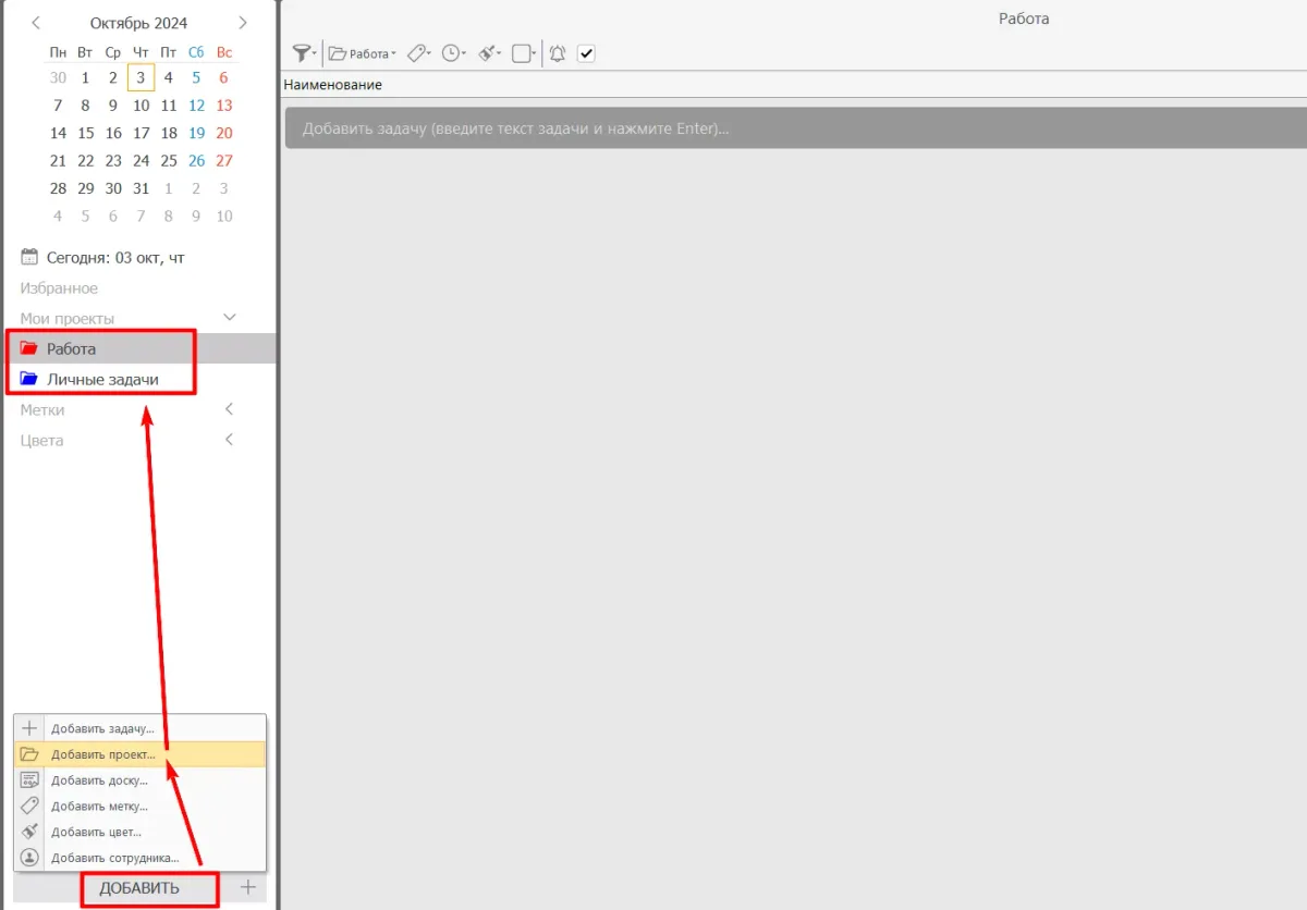 - Создайте проекты для разных сфер жизни. Нажмите «Добавить проект» и дайте им название, отражающее суть, например, «Работа», «Личные задачи».