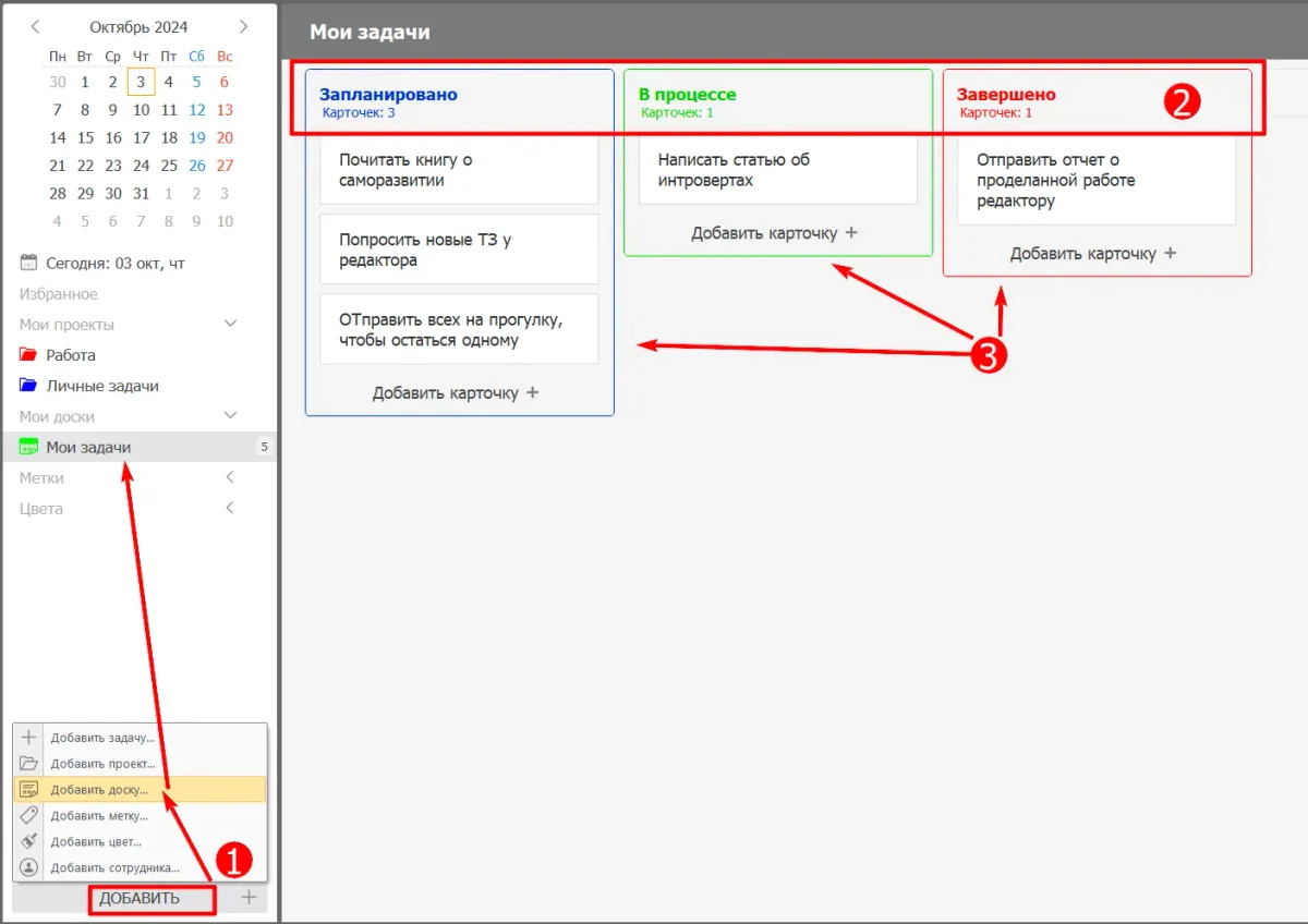 - Создайте канбан-доску. Добавьте нужное количество колонок, например, «Запланировано», «В процессе», «Завершено». Вносите задания в первую колонку и передвигайте по остальным в зависимости от статуса выполнения.
