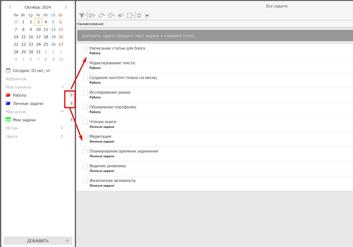 С помощью проектов и задач можно четко организовать идеи и планы, что помогает избежать прокрастинации.