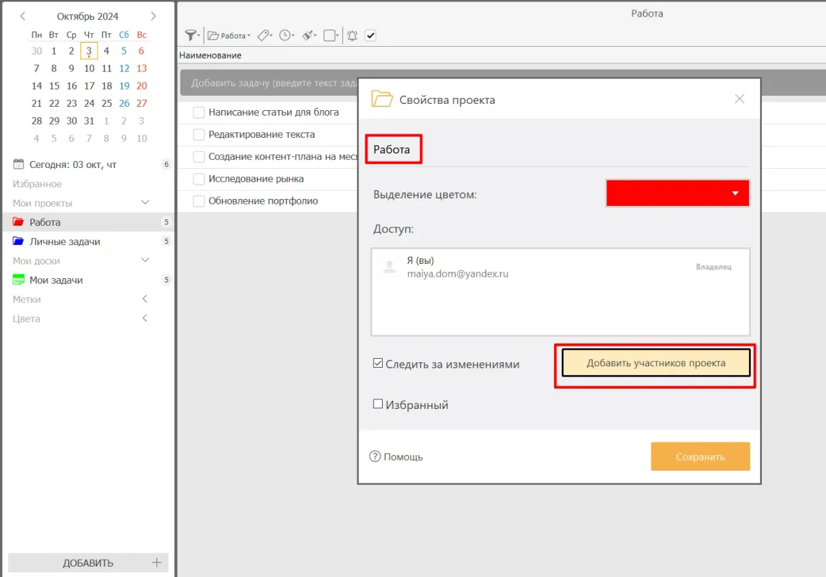 - Если вы работаете в команде, добавьте коллег в проект через «Свойства».