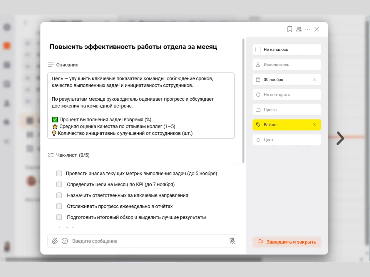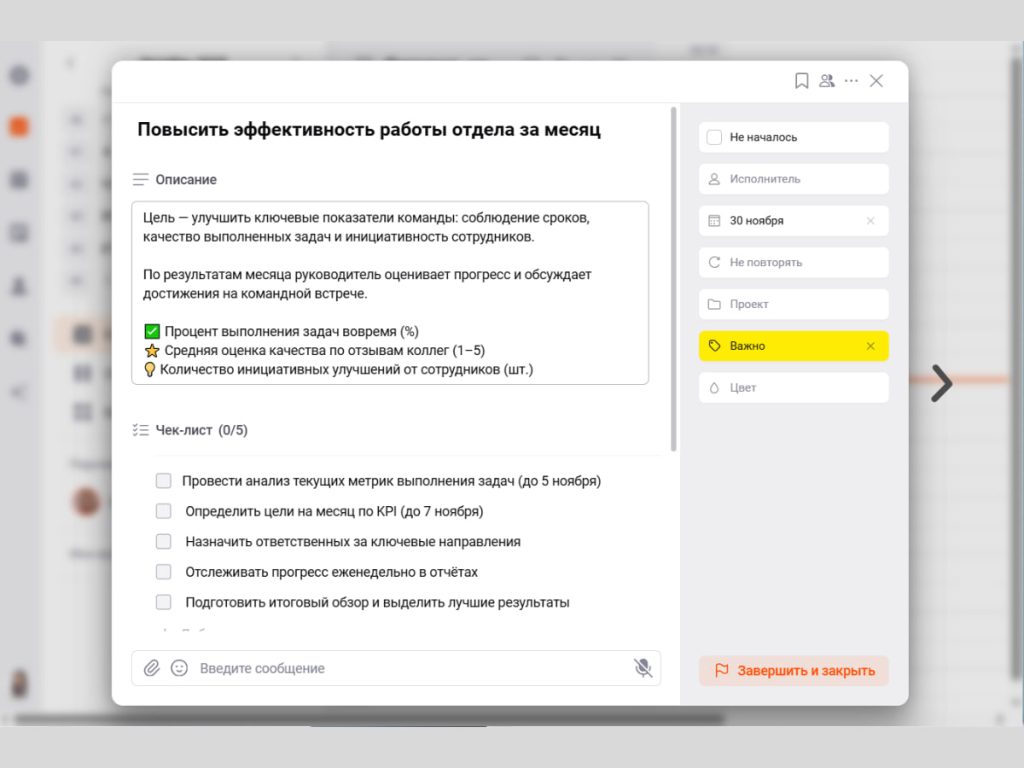 - Настройте шаблоны задач и цели — добавьте метрики: сроки, метки, чек-листы, регулярность.