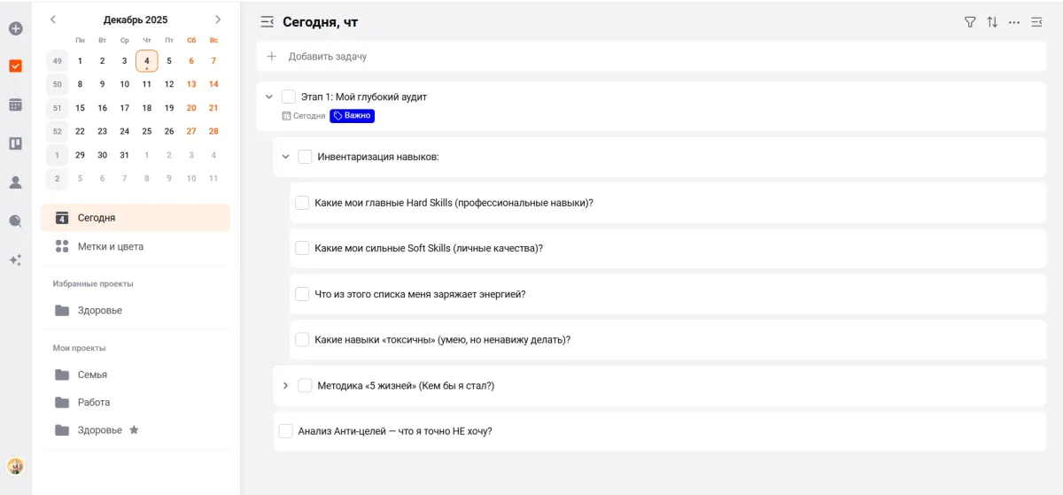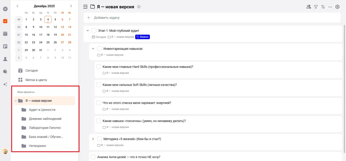 Создайте проект «Поиск себя» и занесите туда первые три конкретные задачи на завтра (например: «Купить блокнот для утренних страниц», «Выписать 20 желаний» или «Найти статью о новой профессии»). Новая, осознанная реальность начинается не с волшебства, а с грамотного планирования. Действуйте!