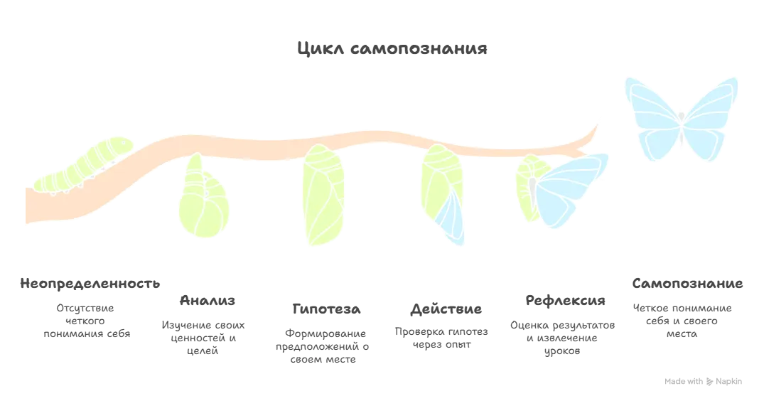 Чтобы не запутаться в экспериментах, используйте схему: «Цикл поиска себя» (Анализ -> Гипотеза -> Действие -> Рефлексия). Это универсальный алгоритм, который превращает хаос в систему.