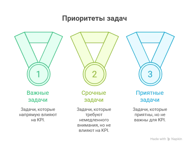 Важно. Без системного подхода к планированию даже талантливый менеджер теряет до 2 часов в день на «тушение пожаров», а не на движение к цели. За неделю это уже полноценный рабочий день, а за месяц — десятки часов упущенной продуктивности. Именно поэтому грамотно выстроенная структура дня напрямую влияет на результаты команды и личную эффективность.
