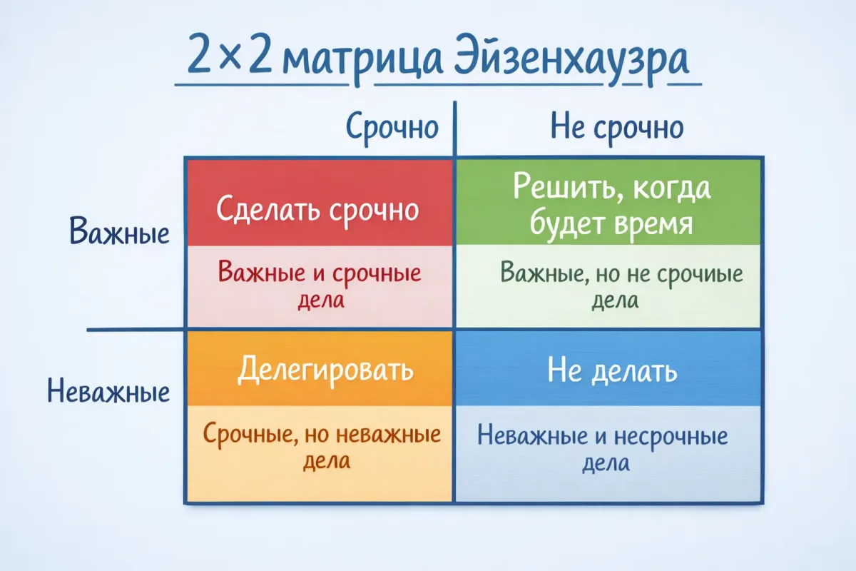 Когда все задачи собраны в одном месте — пора определить их реальный вес. Классический способ — матрица Эйзенхауэра. Она помогает быстро распределять дела по степени влияния на цели и не перегружать день лишним.