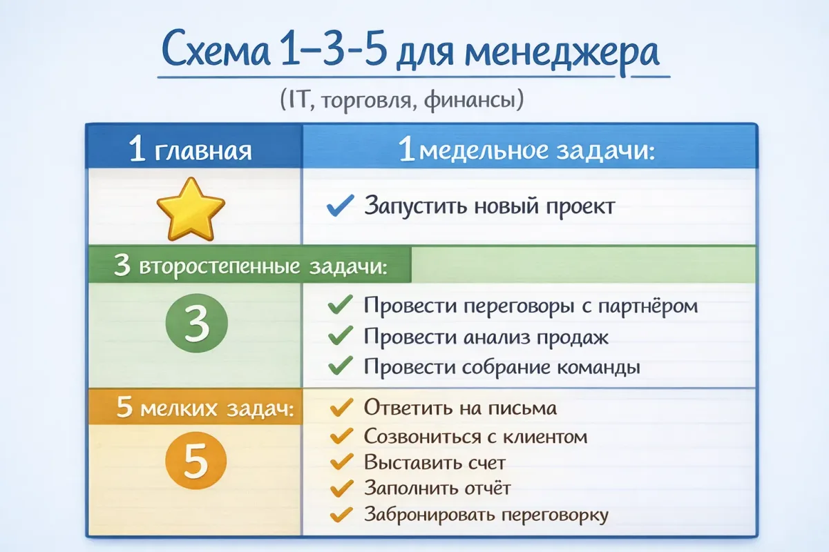 Принцип 1–3–5 предполагает такое планирование работы, при котором каждый день вы выполняете 1 крупную задачу (самую важную и сложную), 3 средних и 5 мелких — рутинных, необходимых для поддержания текущей деятельности.