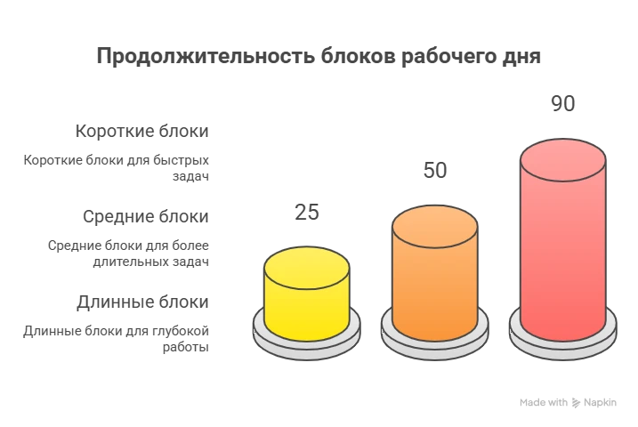 - 90 минут — для глубокой творческой работы и сложных проектов.