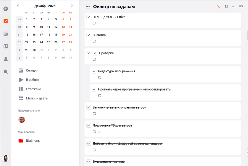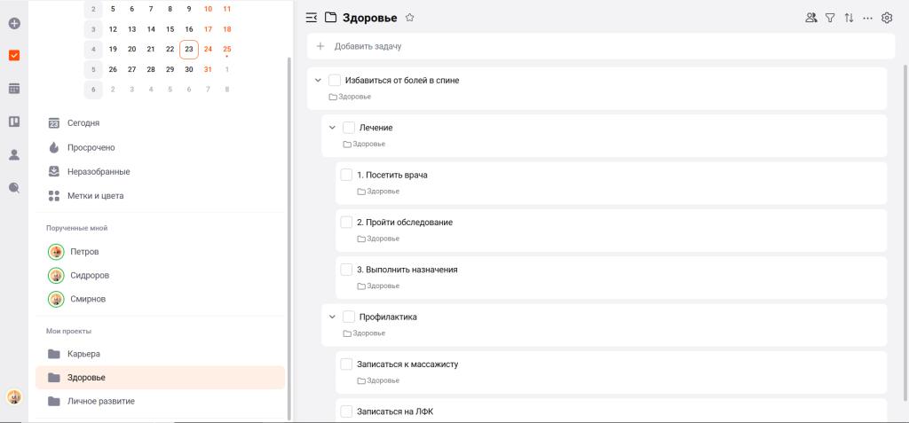 В ЛидерТаске вы можете создавать бесконечную иерархию подзадач. Это помогает превратить пугающий проект в последовательность элементарных действий. Выполнив один мелкий пункт, вы получаете дофаминовое подкрепление и силы двигаться дальше.